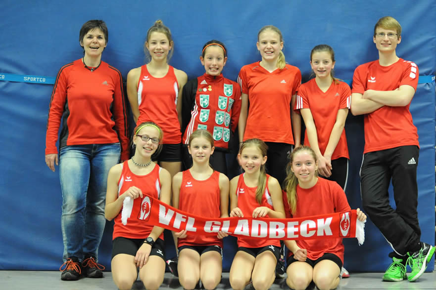 Den Grundstein für die Teilnahme legten die U14-Mädchen des VFL Gladbeck 1921 am Dienstag Abend in Dortmund, denn sie sind in der Gesamtwertung zurzeit auf dem 3. Platz mit 3.569 Punkten. Den Anfang machte die Staffel (4×75 m) mit Emily Klein als Startläuferin, Lena Hoffmann und Sophie Dier auf Position 2 und 3 und Schlussläuferin Christiane Berger in einer Zeit von 43,09 sek (898 Punkte). Die zweite Staffel mit Lea Stwertetschka, Edona Krasniqi-Jule Bludau und Katharina Böttner benötigte 47,51 sek.