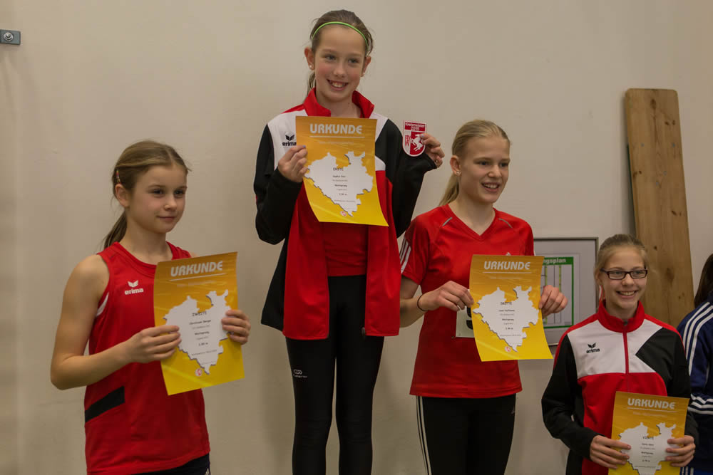 VfLerinnen in der Klasse W12 unter sich Über 60 m siegte Lena Hoffmann (9,16 sec.), Sophie Dier (9,38 sec) und Christiane Berger (9,39 sec.) lieferten sich ein knappes Rennen um Rang 2 und 3. Emily Klein in 9,64 sec auf Rang 4. Im 60 m Hürdensprint tauschten Lena Hoffmann und Emily Klein die Plätze. Emily siegte in 11,31 sec., Christiane Berger (Zweite in 11,45 sec), Sophie Dier (12,11 sec.) und Lena Hoffmann (12,55 sec) folgten auf Rang 2 – 4. Im Hochsprung siegte Emily Klein 1,25 m, Dritte und Vierte wurde Christiane Berger und Lena Hoffmann mit 1,15 m. Eine knappe Entscheidung gab es im Weitsprung: Sophie Dier (3,90 m) siegte hauchdünn vor Christiane Berger (3,89 m), Lena Hoffmann (3,84 m) und Emily Klein (3,79 m). Das Kugelstoßen gewann Emily Klein mit 7,28 m.
